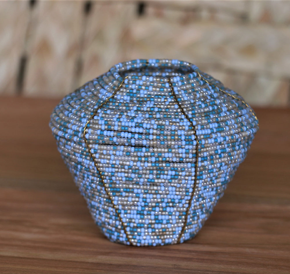 Mzinga, Swahili for hive, beautiful containers feel great in the hand. This technique of beading on a wire is used by Samburu artisans for their wedding necklaces.